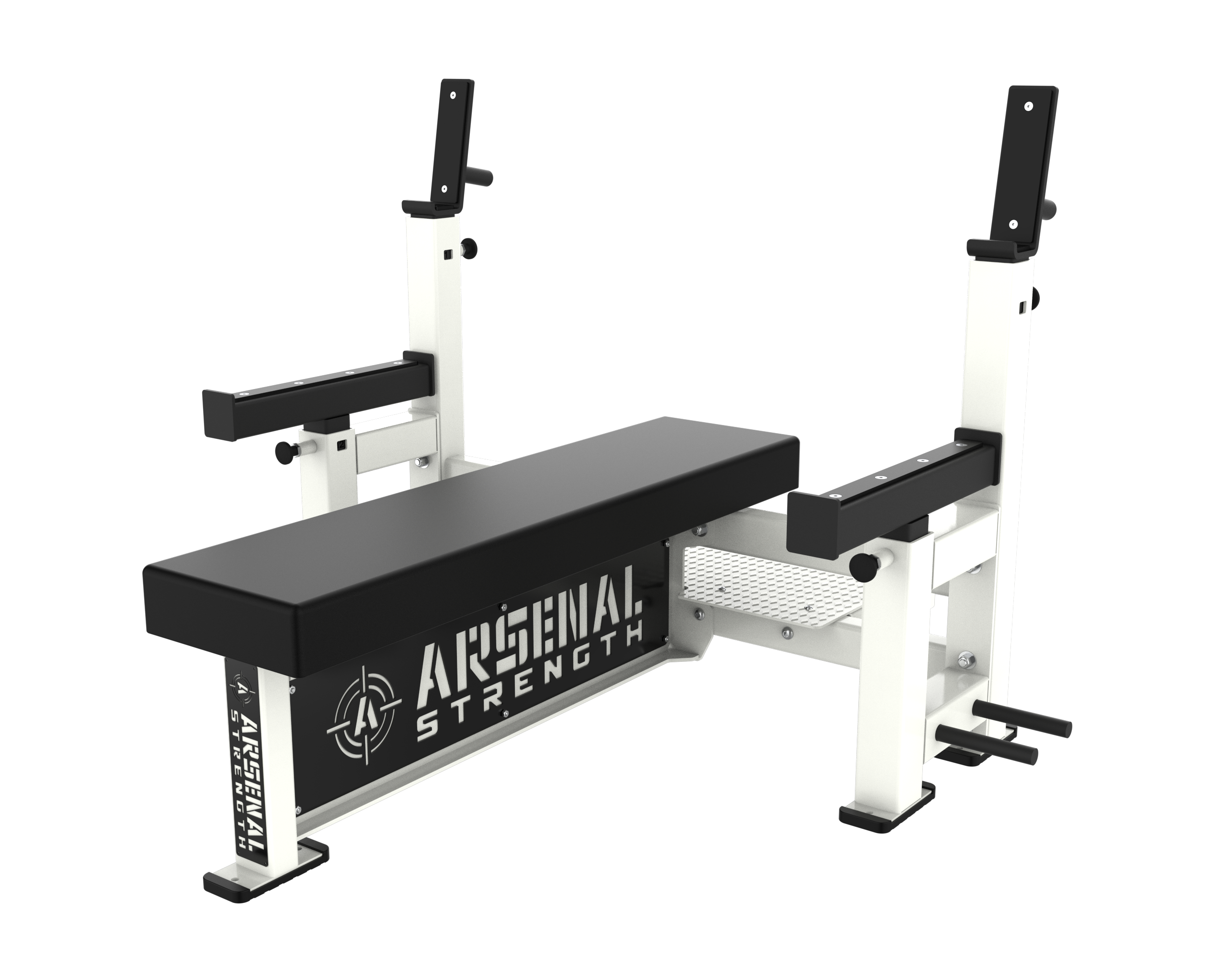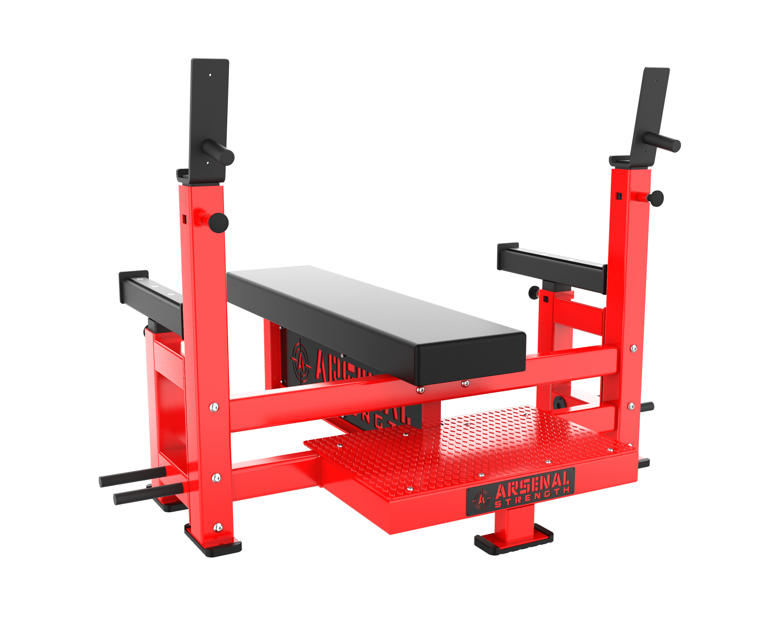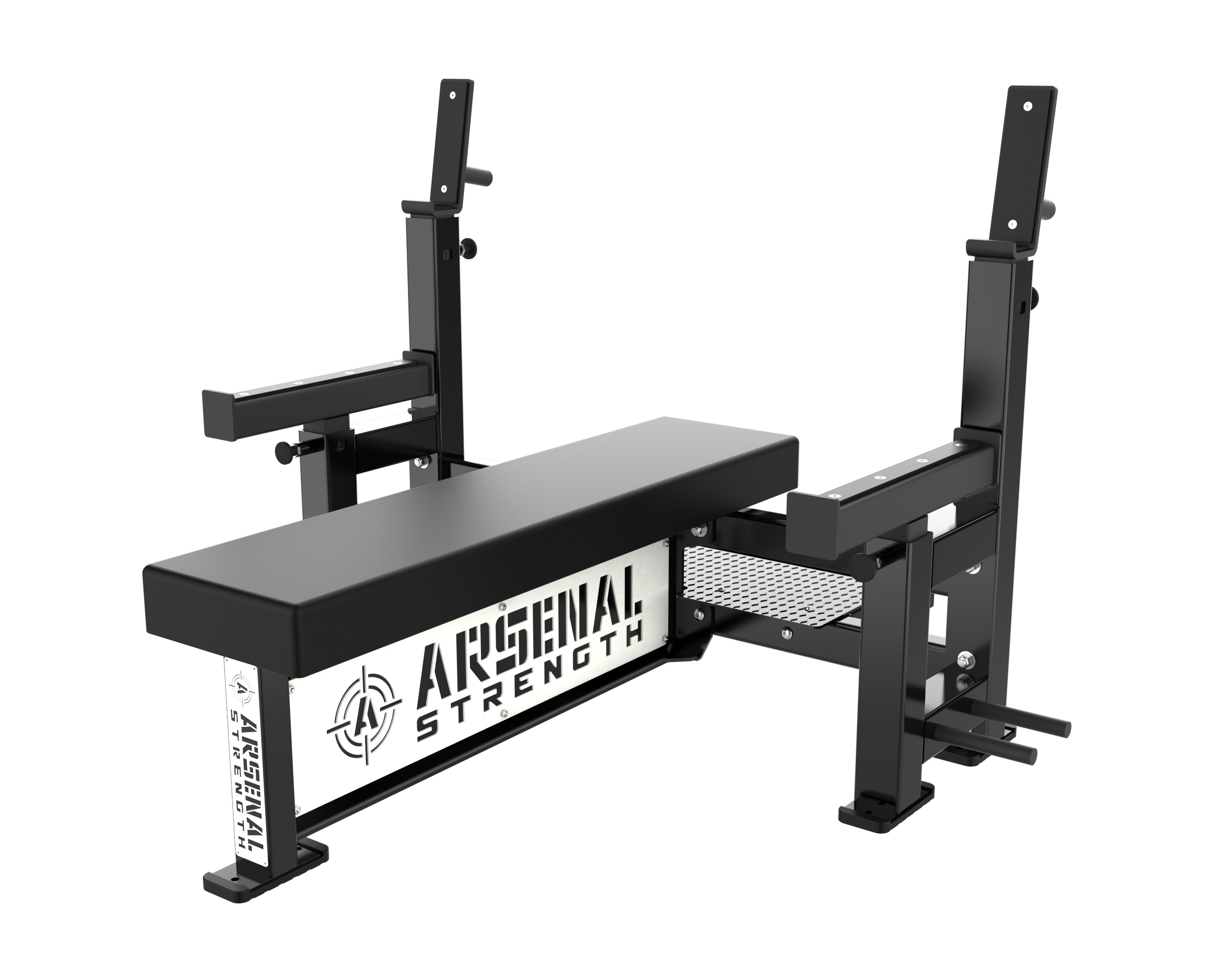 The Arsenal Strength Alpha Competition Flat Bench has all the necessary features for a true powerlifting-style bench press training session. Adjustable height bar catches, adjustable face savers, spotter platform, an extra wide pad with grip dot upholstery, and standard band pegs provide you with all the tools you need to get the most out of your bench press.
