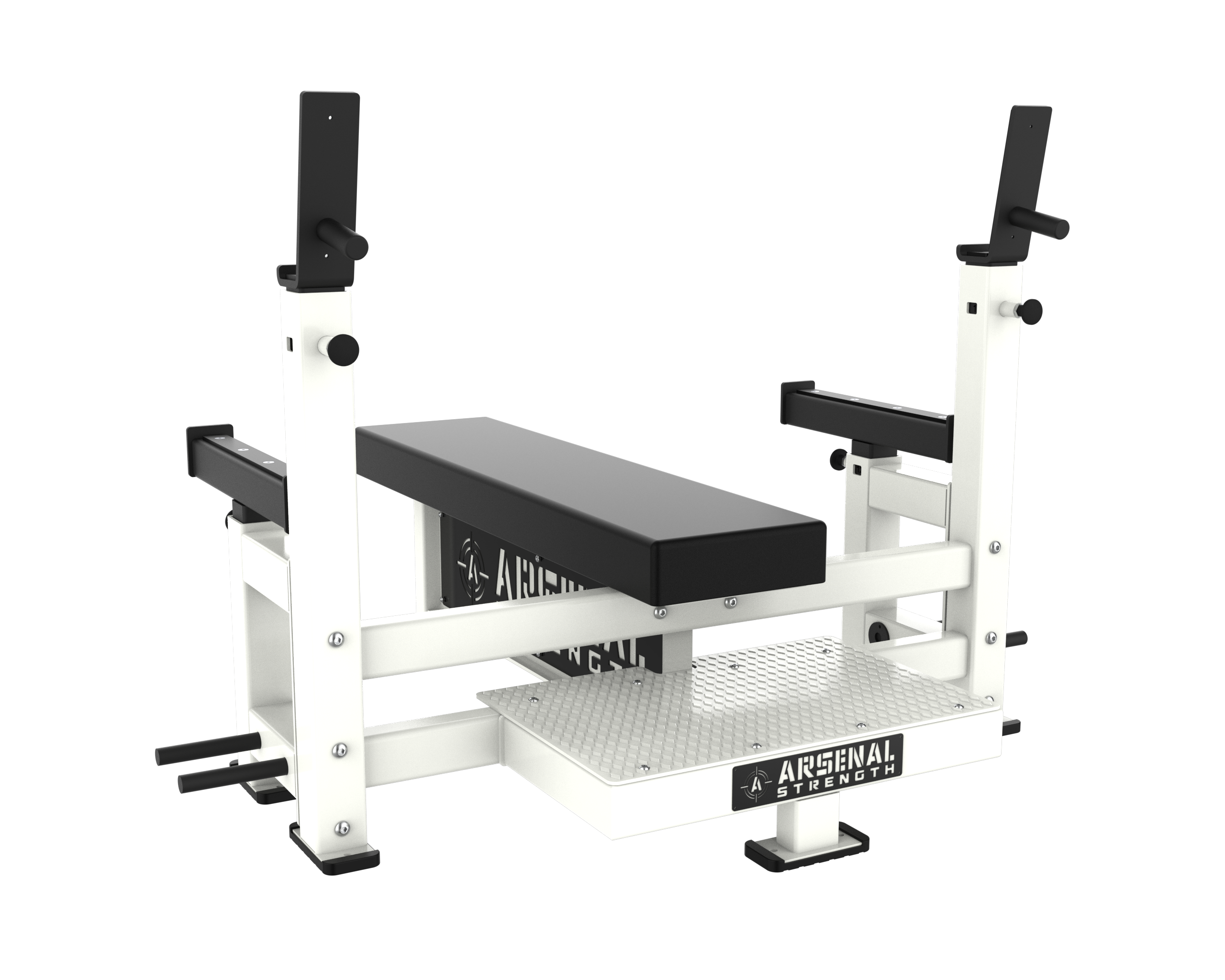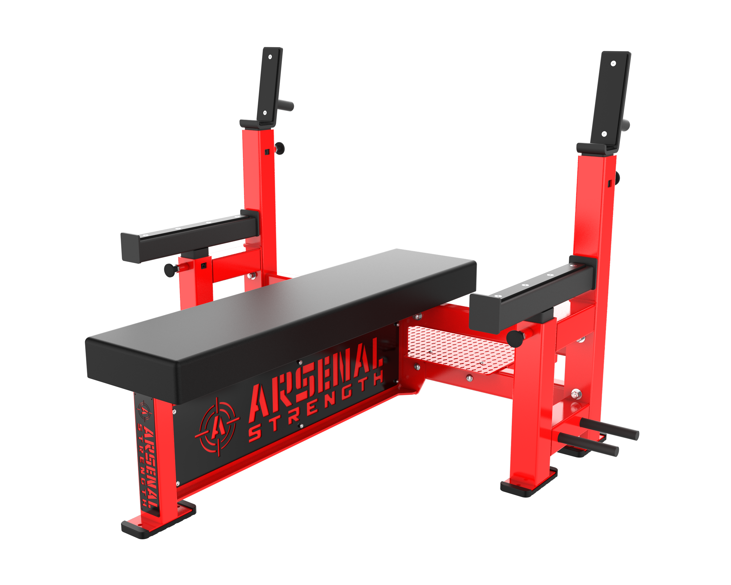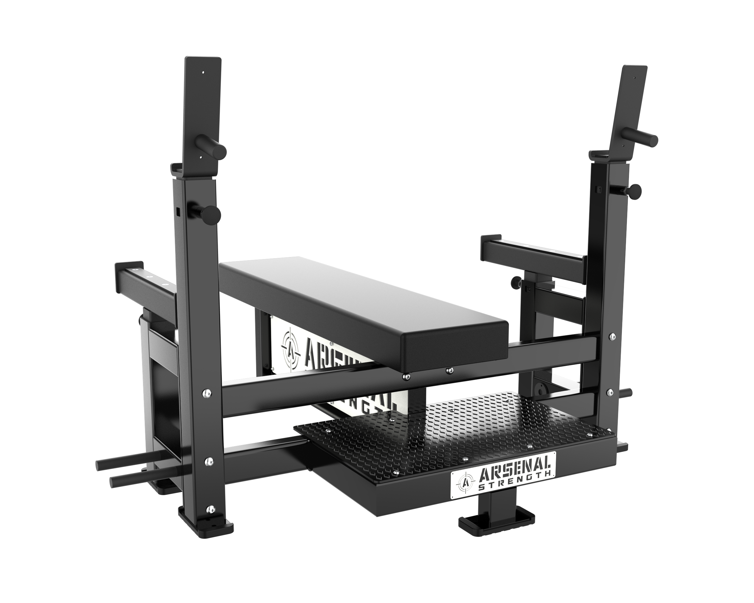 The Arsenal Strength Alpha Competition Flat Bench has all the necessary features for a true powerlifting-style bench press training session. Adjustable height bar catches, adjustable face savers, spotter platform, an extra wide pad with grip dot upholstery, and standard band pegs provide you with all the tools you need to get the most out of your bench press.