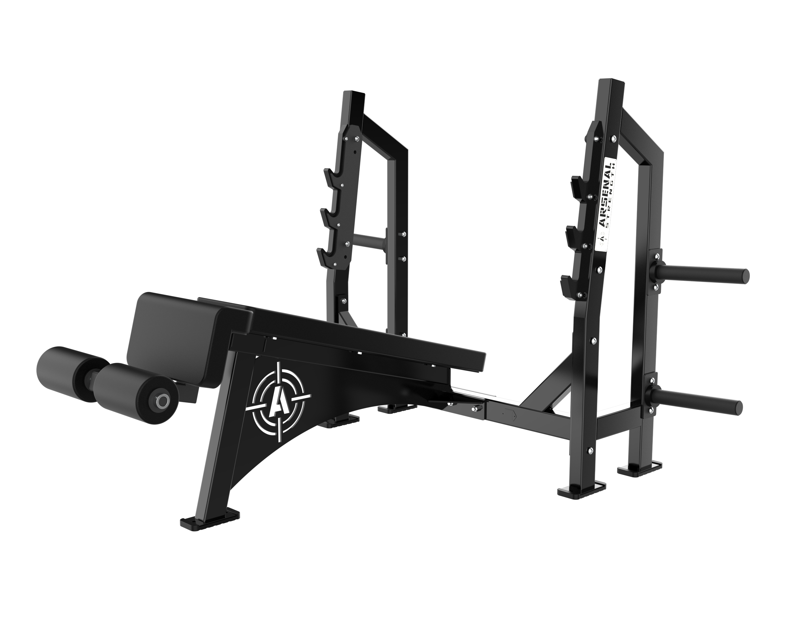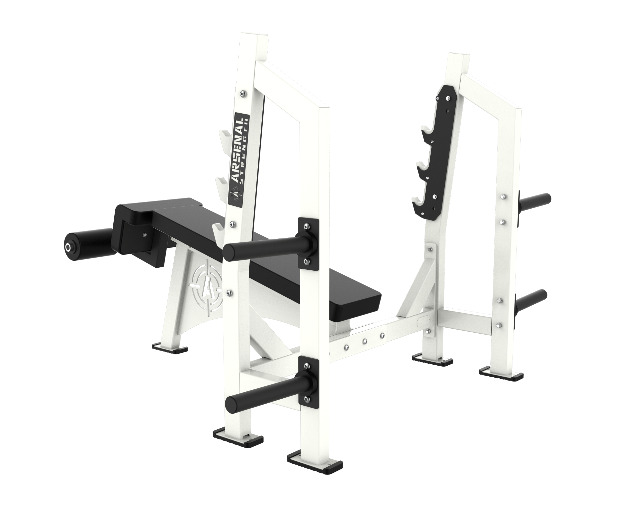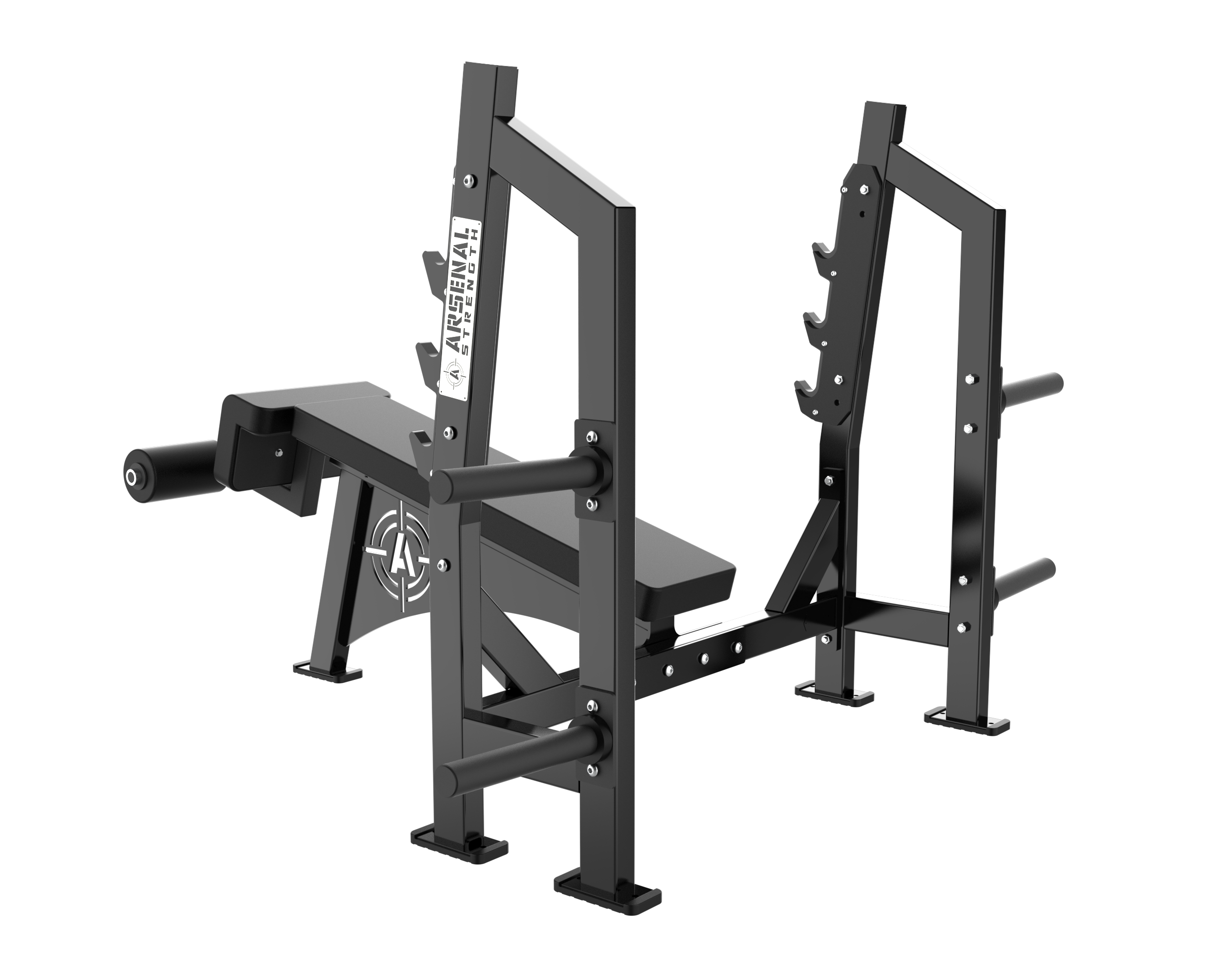 The Arsenal Strength Alpha Olympic Benches features a heavy duty look and feel. Our Olympic Benches are custom made to order featuring a walk through spotter stand. Additional plate storage is standard.
