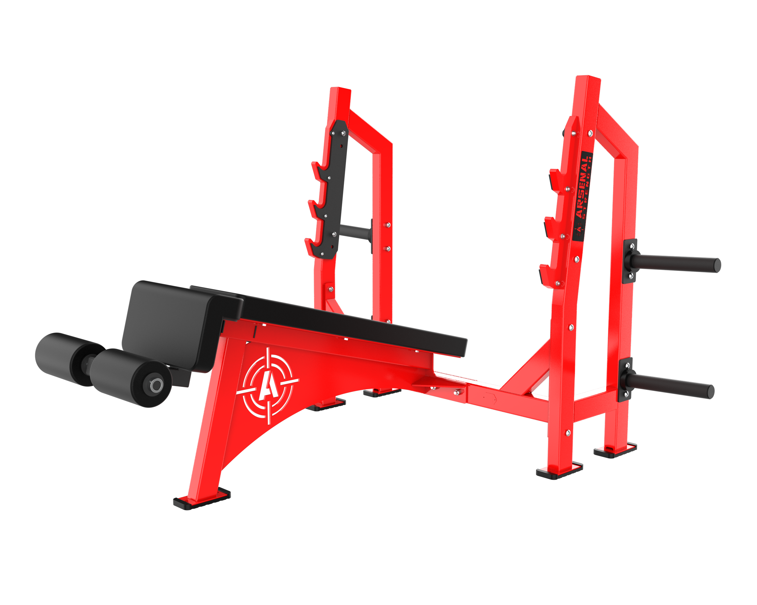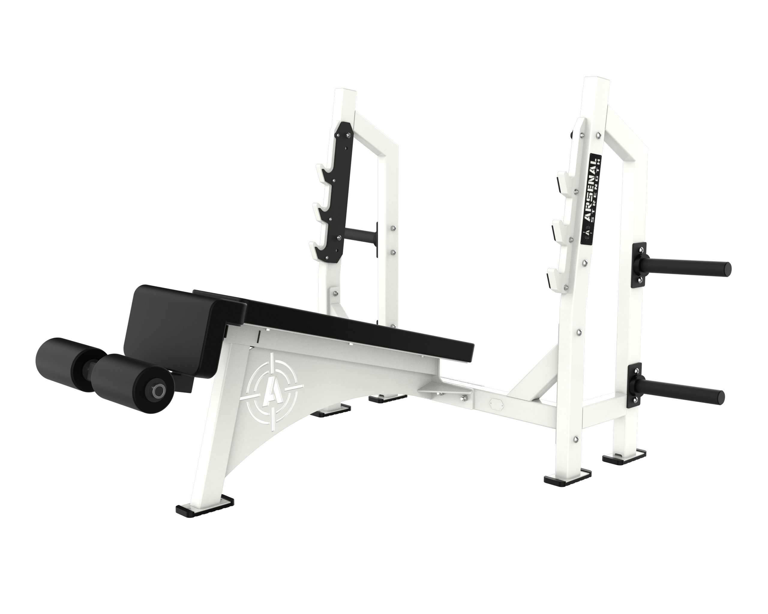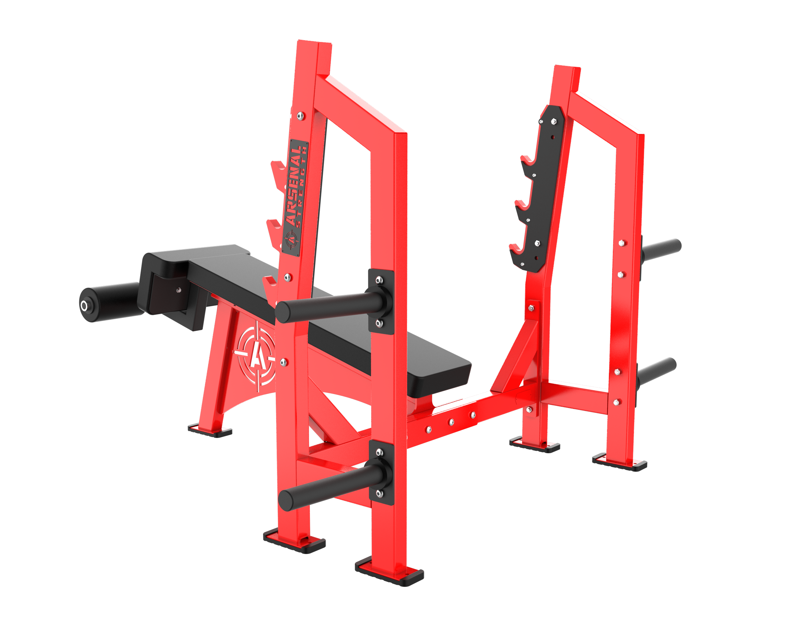 The Arsenal Strength Alpha Olympic Benches features a heavy duty look and feel. Our Olympic Benches are custom made to order featuring a walk through spotter stand. Additional plate storage is standard.