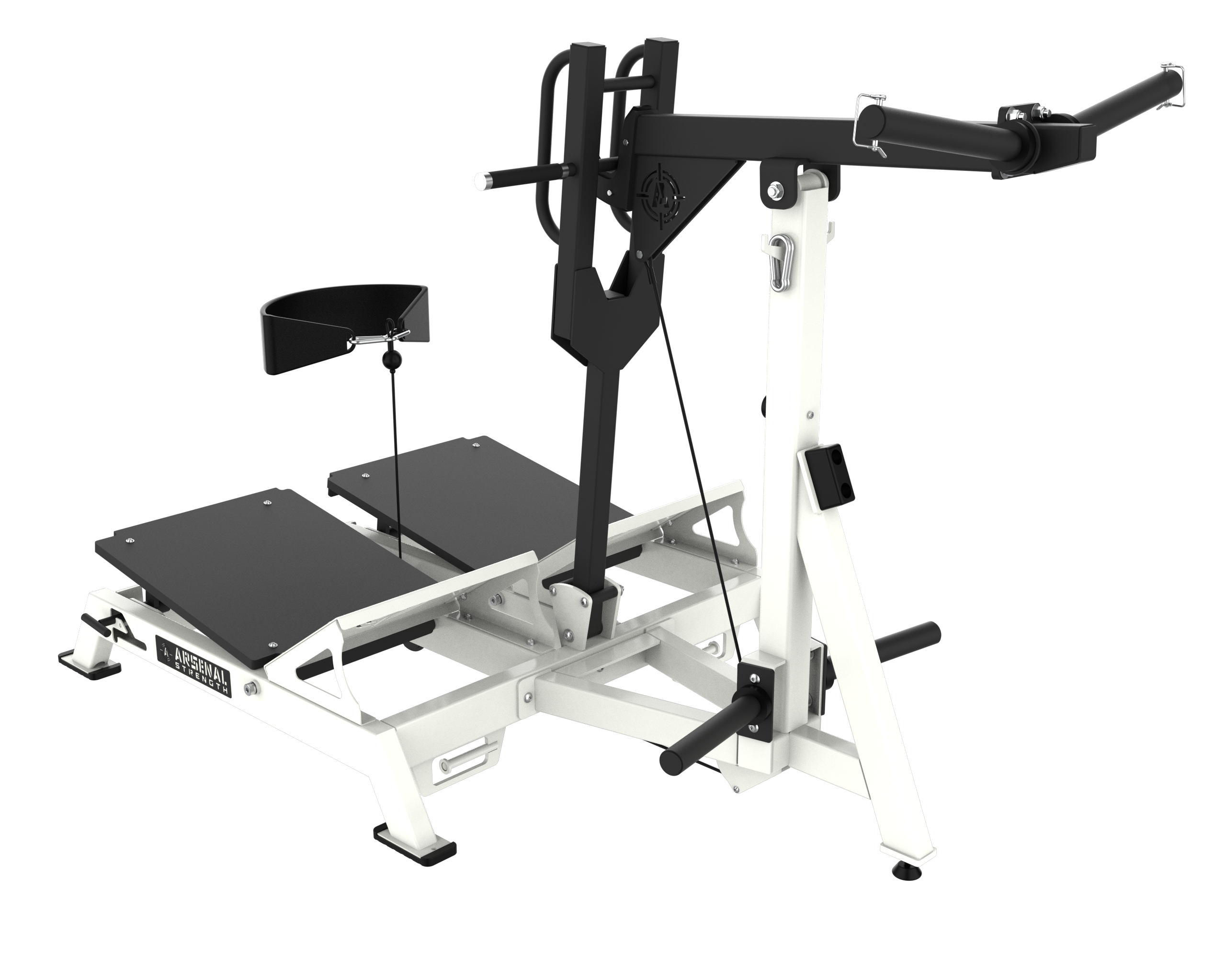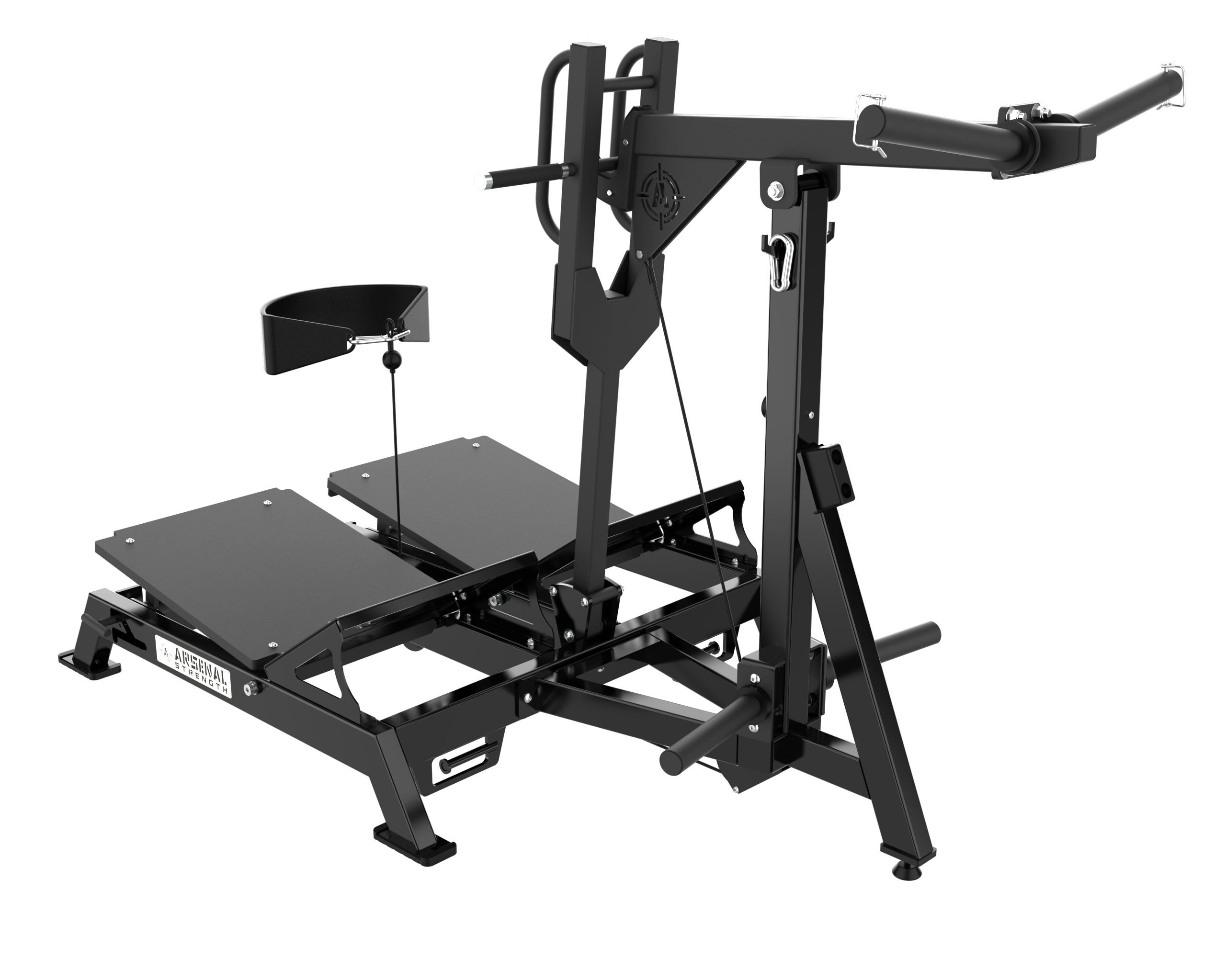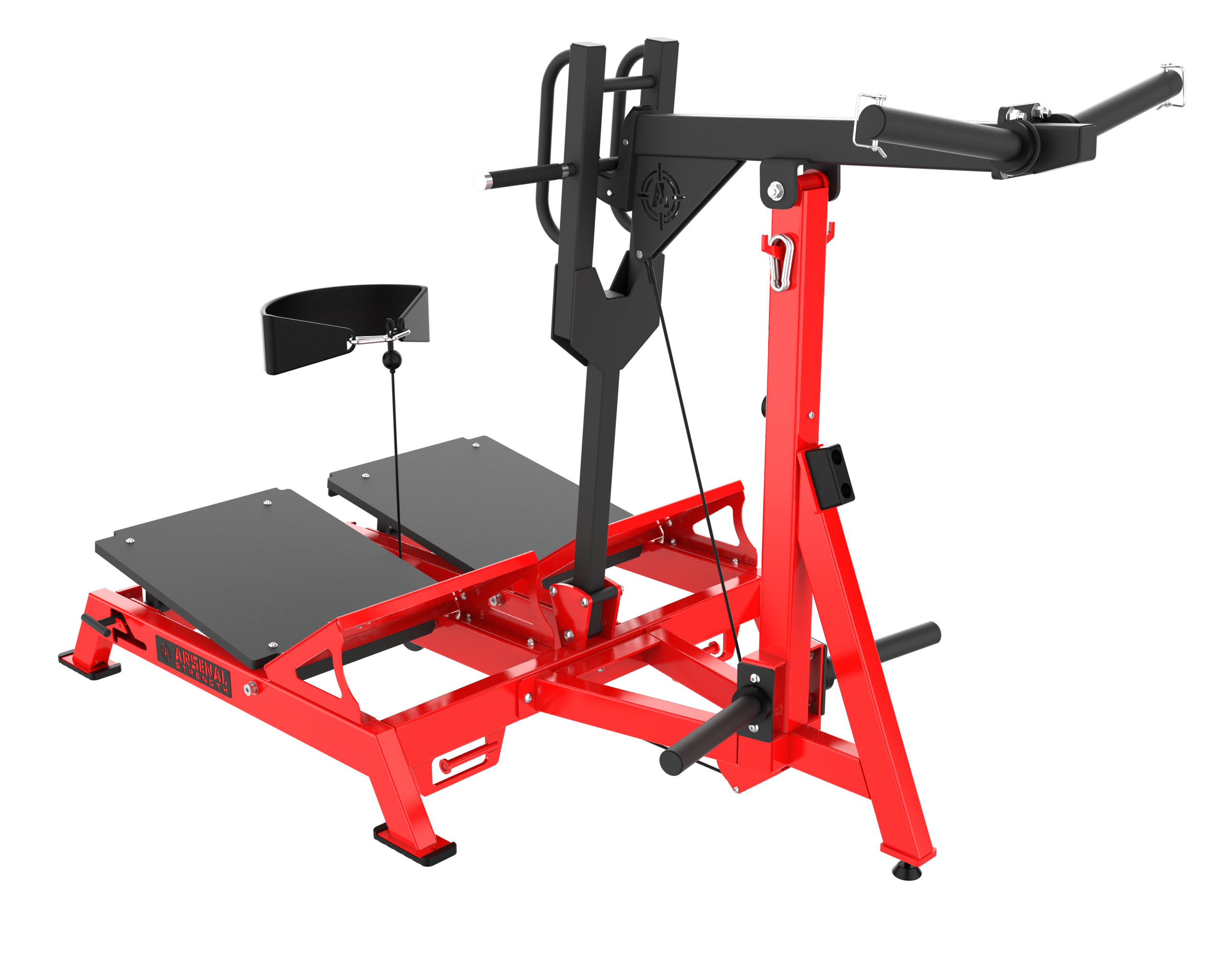 PATENTED Arsenal Strength Reloaded Belt Squat is designed with dual multi angle adjustable platforms to allow users to target specific areas during exercise. Large range of motion for maximum squat depth. An action system combining a lever arm and a cable allows the user to perform a large variety of movements in multiple planes of movement.